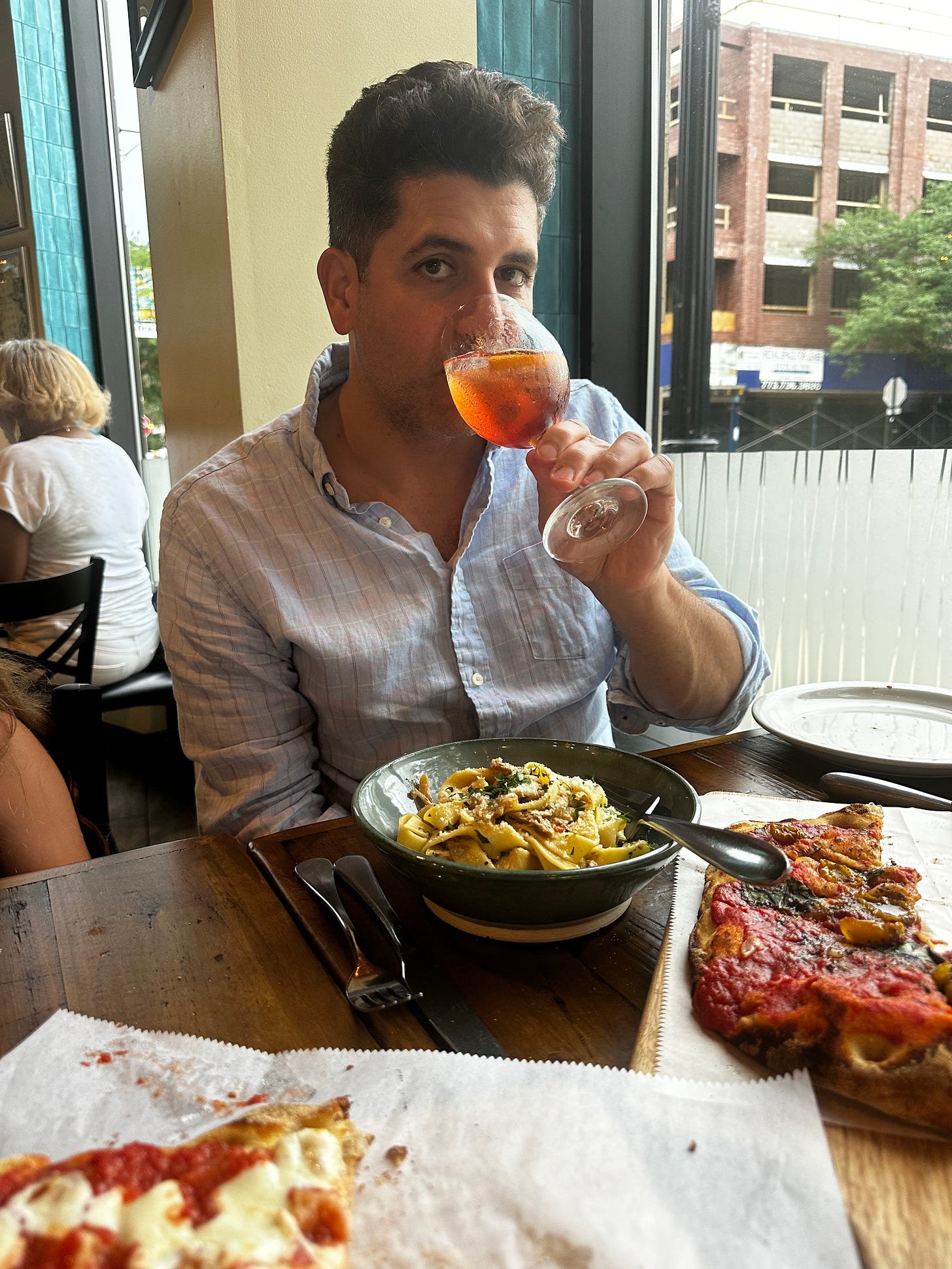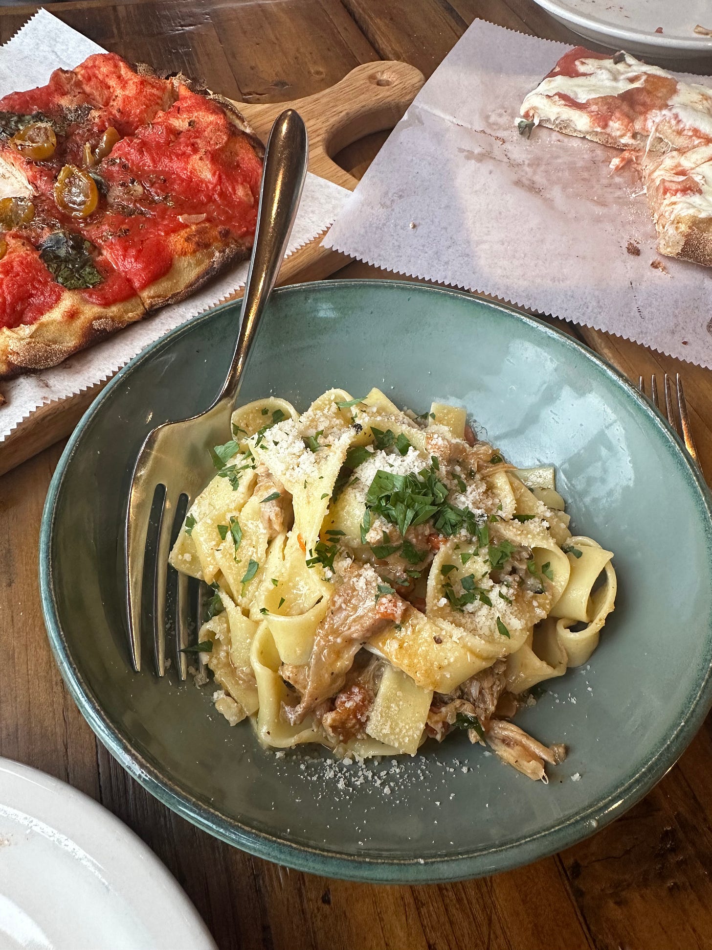 I started with the suppli—fried tomato risotto balls with molten cheese inside. They were spot on, just like the ones I devoured in Rome. The pizzas were equally impressive, with that classic Roman-style balance of crisp crust and flavorful toppings. But my favorite dish of the night was the pappardelle al ragù di coniglio, basically a slow-reduced rabbit stew tossed with wide homemade pappardelle noodles. It was rich, delicate, and executed perfectly.