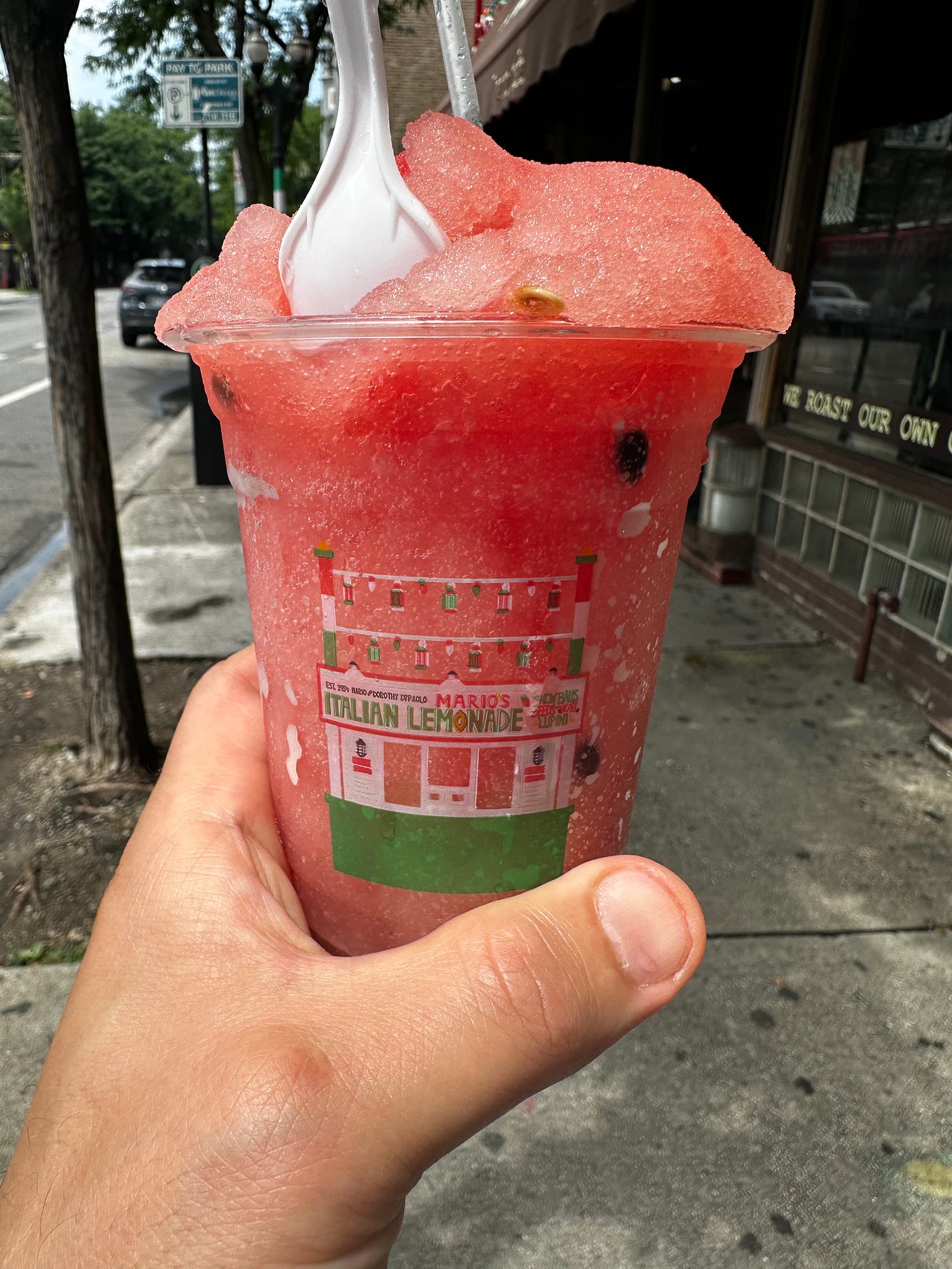 As a bonus, being in Little Italy meant Mario’s Italian Lemonade was right across the street. This historic stand has been cooling people off since 1954 and is still family-run. It’s not a typical lemonade but more like shaved ice with real fruit blended into it—light, refreshing, and perfect after a heavy beef sandwich in the summer heat. They had about fifteen flavors that day, from classic lemon to cantaloupe to lychee. I went with watermelon. All of their flavors are made from fresh fruit, which gives them this natural sweetness that feels like electrolytes in an iced cup. Exactly what I needed.