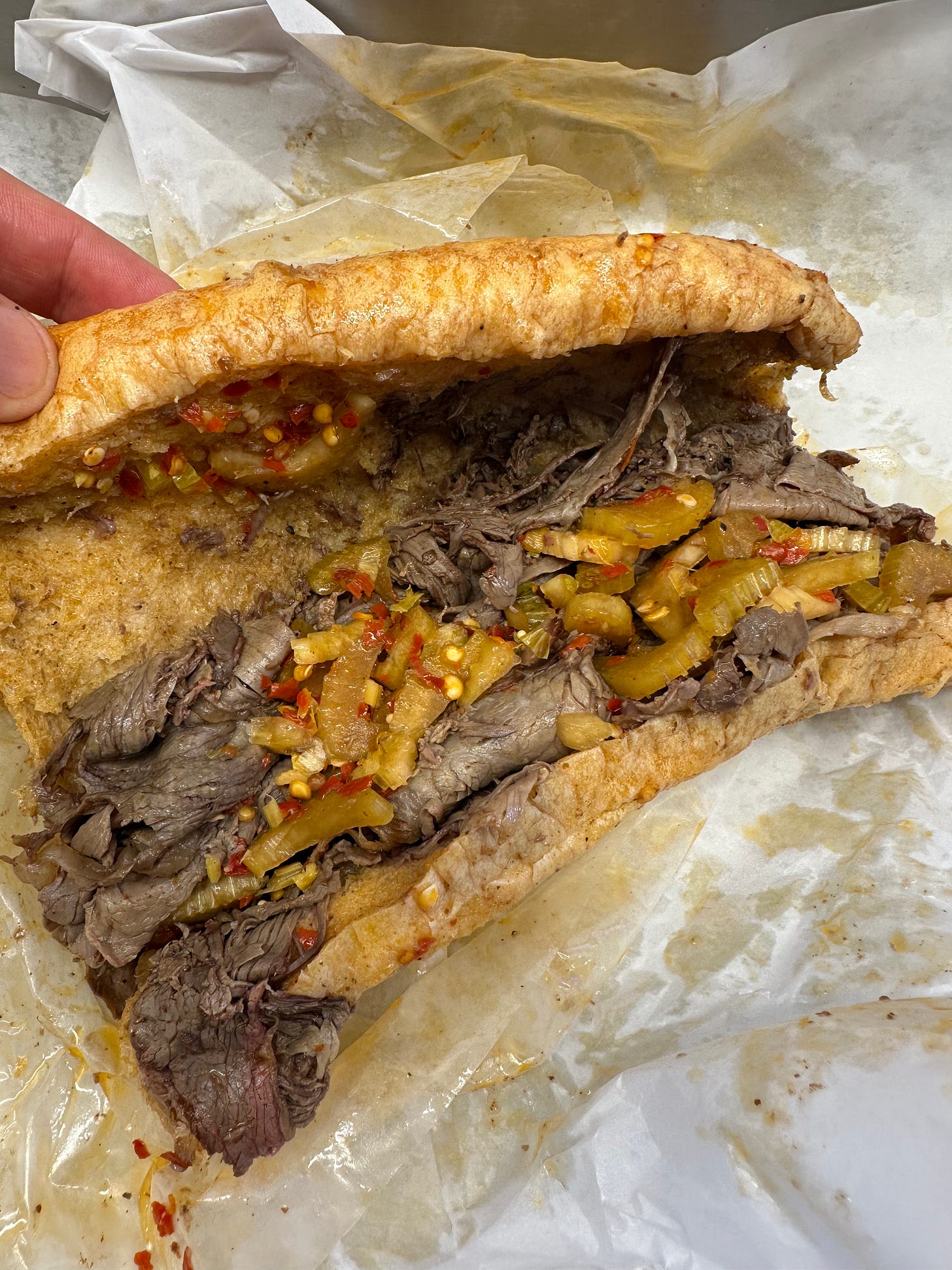 I ordered the Italian beef, dipped, with hot peppers. “Dipped” means the whole sandwich is briefly dunked in the beef jus, soaking the bread in all that rich, brothy flavor. Every bite was beefy, juicy, and full of spice from the giardiniera. You can’t eat it cleanly, so you have to master the “Italian lean”—standing at the counter, leaning forward with elbows out to let the juice drip right onto the paper instead of down your shirt.