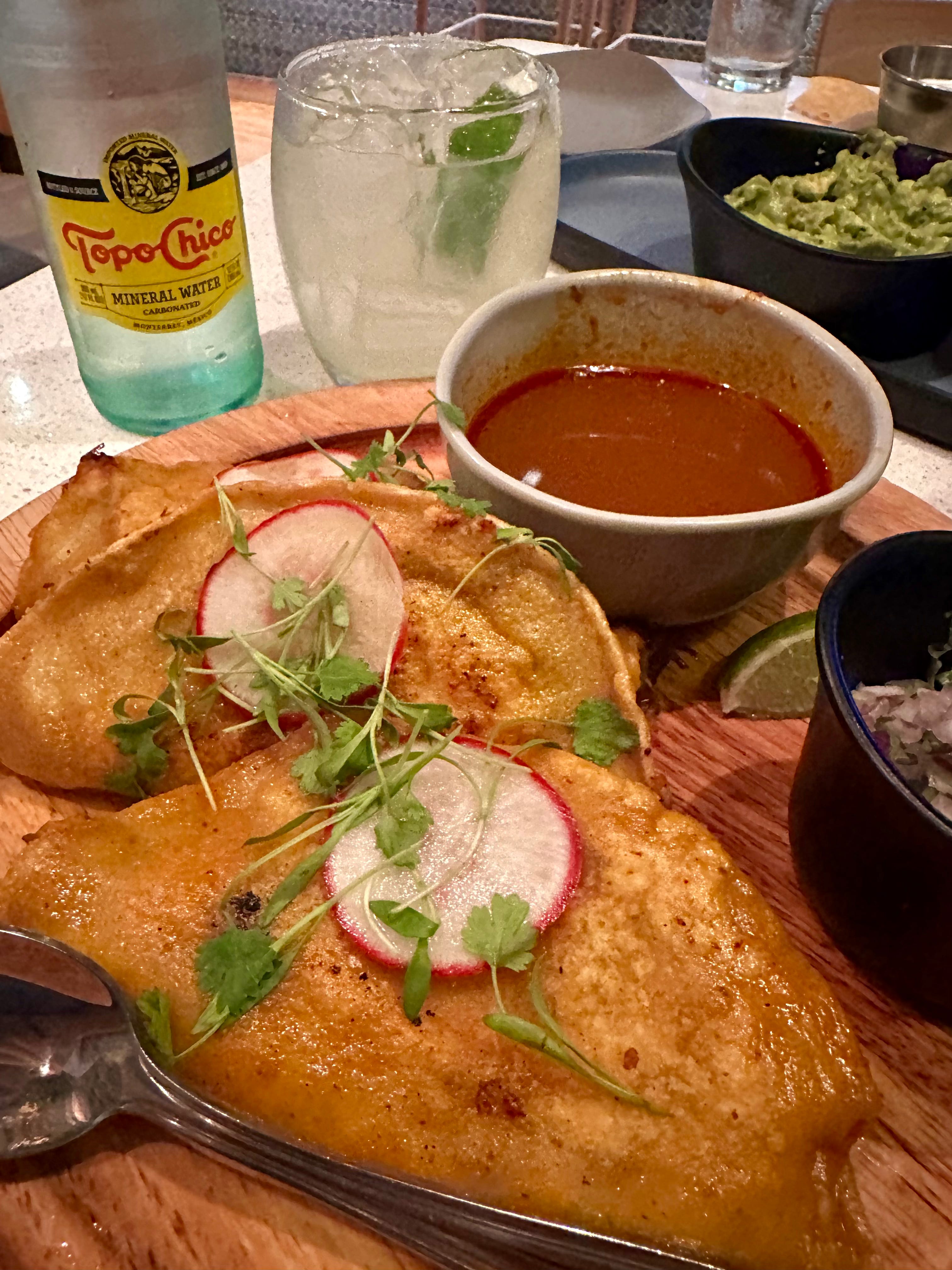 For food, I ordered tacos al pastor and birria tacos. The pastor, made with ancho-rubbed pork, chile de árbol salsa, and tiny diced pineapple, was my favorite. That little hit of sweetness in every bite is why al pastor will always be my preferred taco. The birria tacos were braised short rib quesabirria with crispy corn tortillas, Chihuahua cheese, and a side of consommé for dipping. I’ve been enjoying birria tacos a lot lately, and this one delivered on that rich, meaty flavor, but the pastor still won for me.