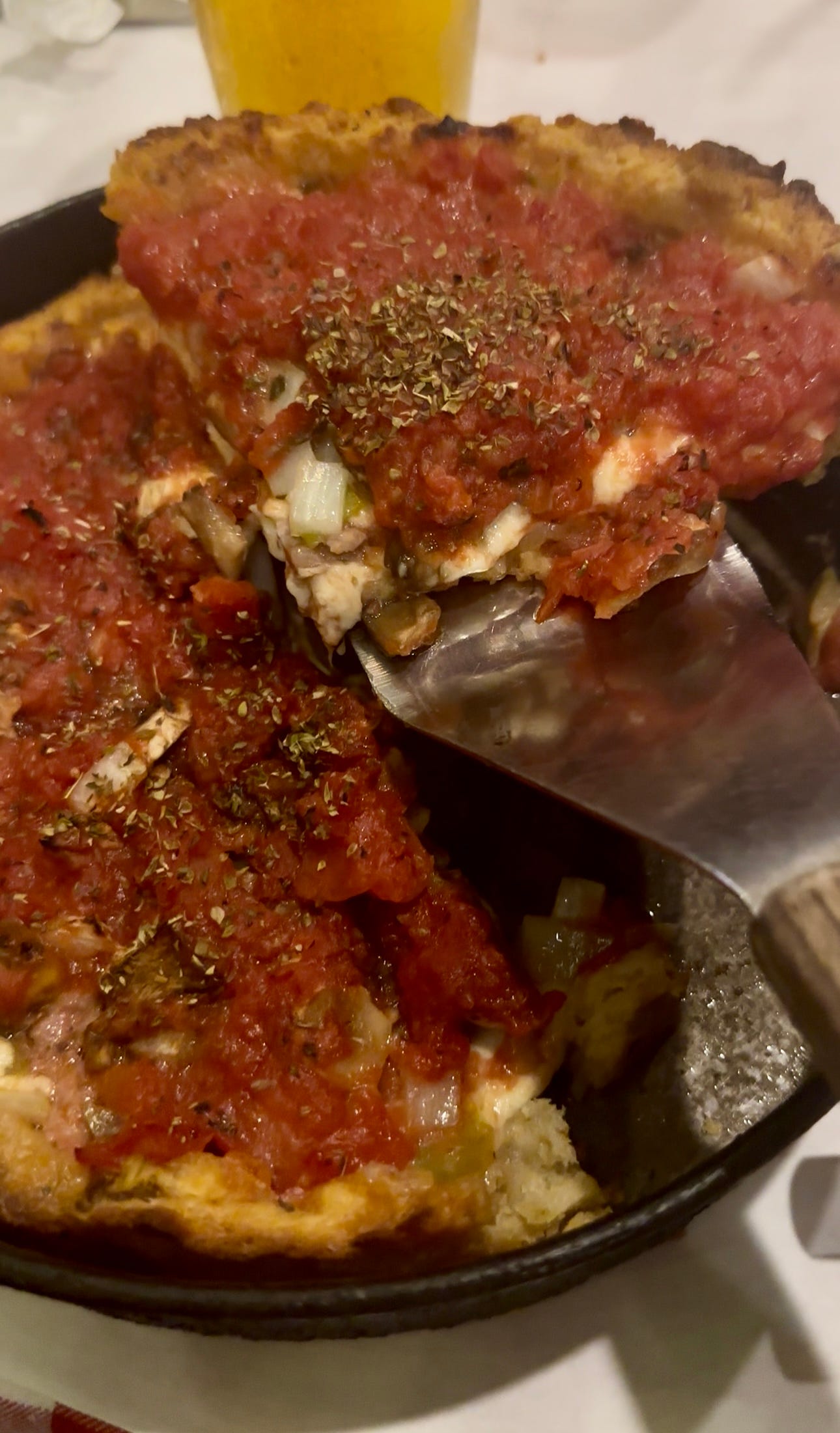 For my first stop, I went for an old-school deep-dish experience at Pizano’s Pizza & Pasta. We ordered the Special Double Deep Dish Rudy’s Pizza, loaded with sausage, mushrooms, green peppers, onions, and mozzarella, baked into that classic buttery crust. Exactly what I was looking for—cheesy, rich, and unapologetically heavy in the way Chicago deep-dish should be. A cold beer was a must.