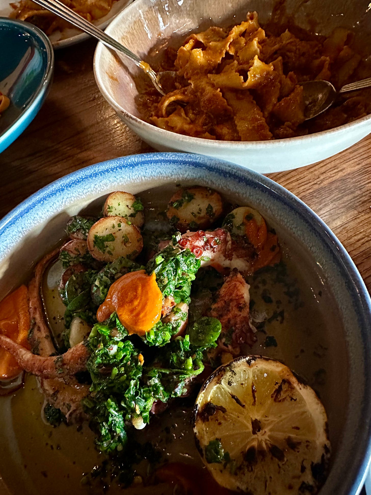 On this visit, we ordered the spicy octopus—marbled potatoes topped with jalapeños, sambuca, chimichurri, and almonds—and the tagliatelle with lamb ragu, onions, crispy guanciale, and manchego. Both dishes hit right: the octopus was tender with a nice heat and nutty snap, while the tagliatelle was rich, earthy, and perfectly balanced. The wine list remains huge and deeply inspirational—still a treasure trove for any sommelier or wine lover.