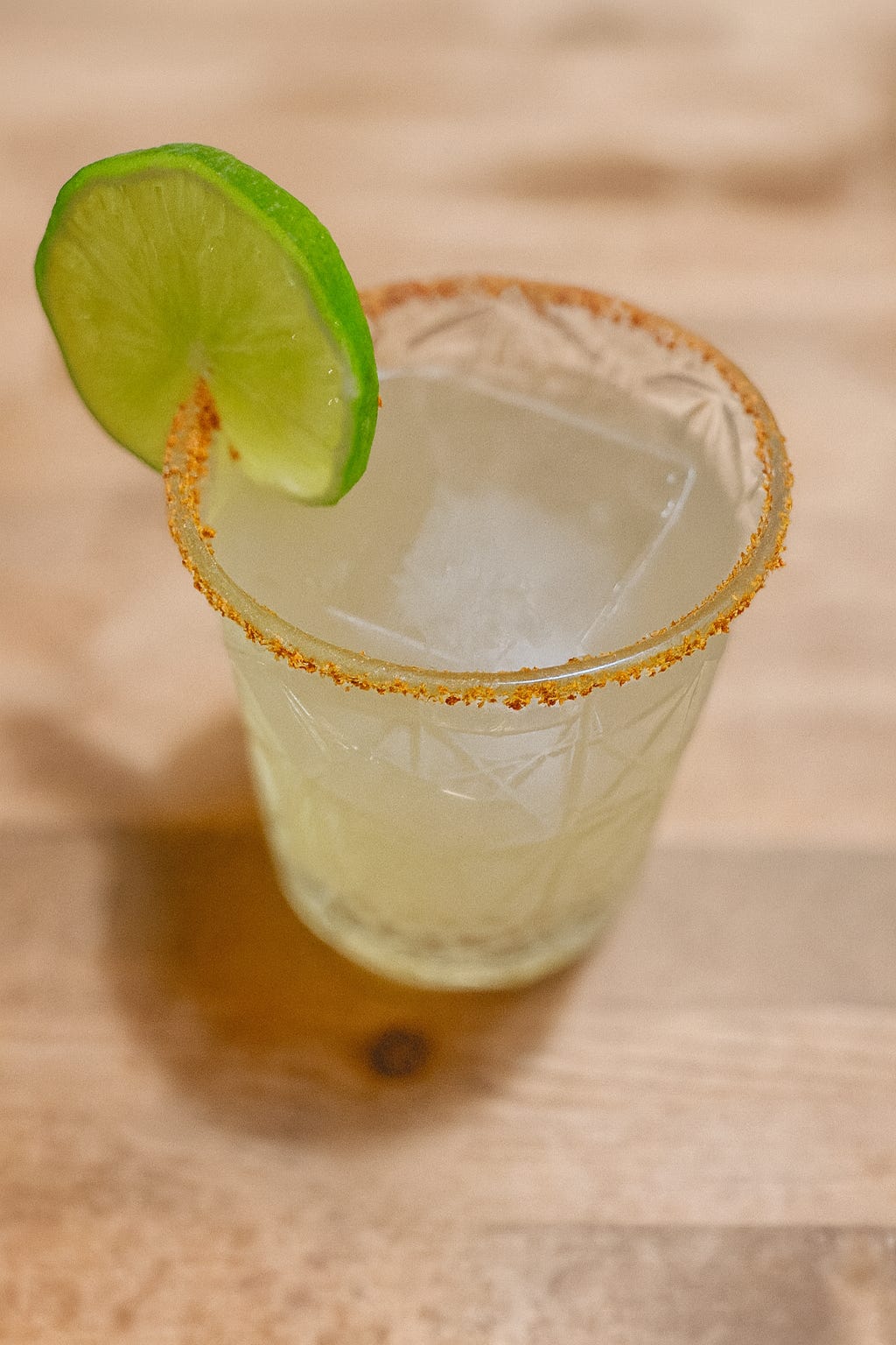 Rub the rim of a rocks glass with a lime wedge, then dip or sprinkle Tajín (or kosher salt) to coat.