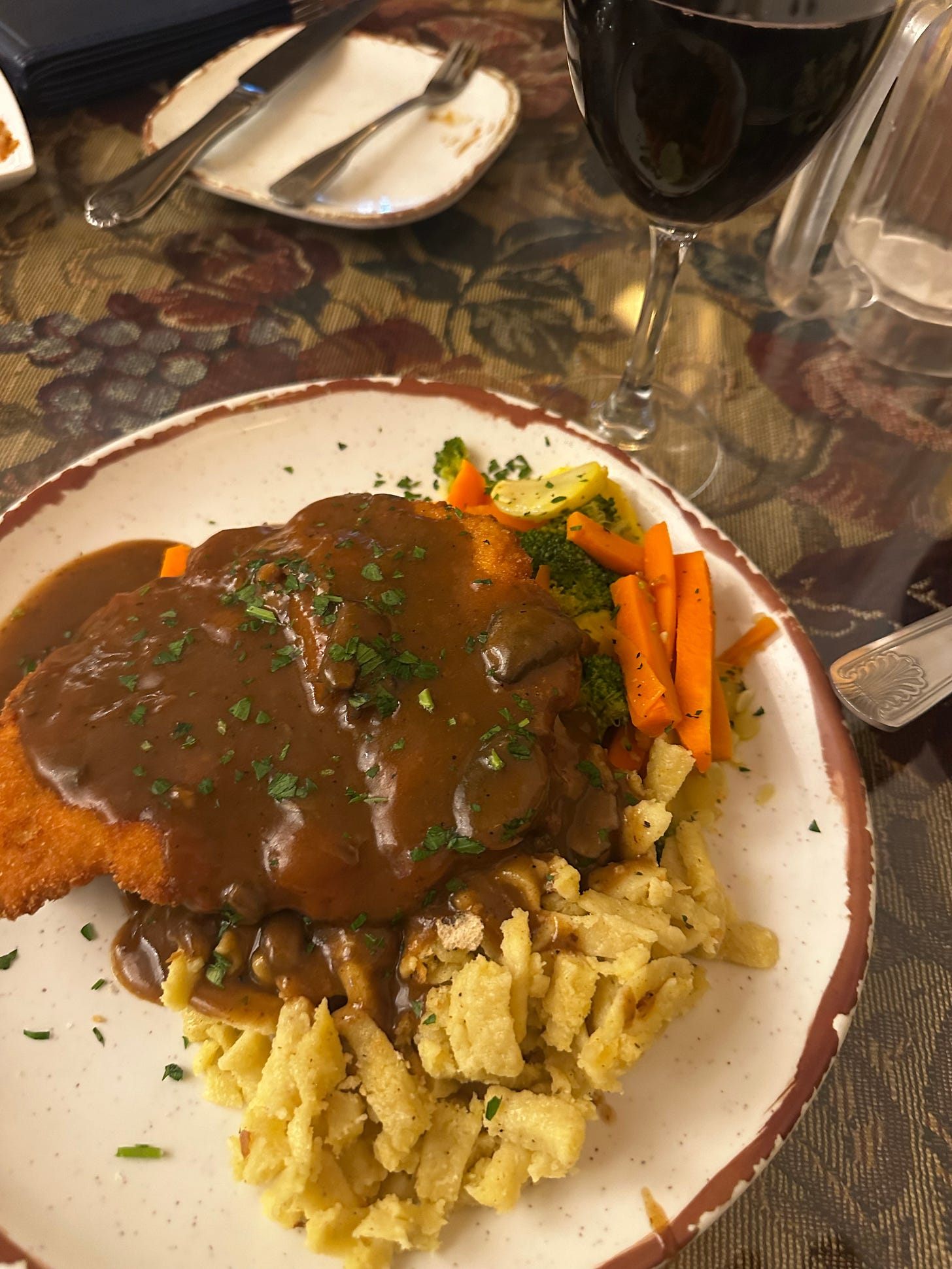 For me, it was the kind of comfort meal that fits perfectly after a few days of hiking. I started with a plate of Rüdesheim Schweinebauch, crisp pork belly with sauerkraut and red cabbage alongside a Hefe-Weizen. For the main course, the Jägerschnitzel: breaded pork cutlet topped with a rich mushroom gravy, served with spaetzle and vegetables. By far the best schnitzel I have ever had. You could tell the spaetzel was hand done. I finished with a slice of Black Forest torte and a glass of the light German red wine, Dornfelder. Exactly what I wanted.